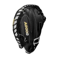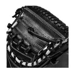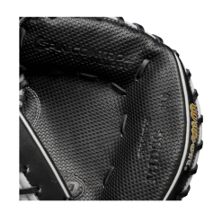 Prepare to throw out would be base-stealers with the A2000® SCM1DSS, a 33.5” catcher’s mitt with Spin Control Technology™ in the Black Pro Stock® leather palm. The patented surface texture in the palm and Half Moon Web is engineered to increase friction against the ball, helping players get a quick grip on transfers and fire away to any base. This 33.5” mitt with a deep pocket is preferred by elite backstops to frame balls on the edge of the zone or pick off-speed pitches out of the dirt. Equipped with lightweight Black SuperSkin™ and gradient Bold Logos, this catcher’s mitt brings a menacing look behind the dish.